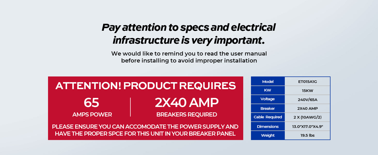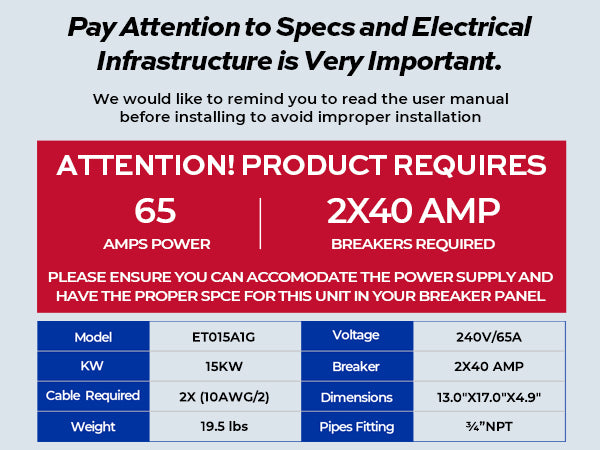 𝐈𝐦𝐩𝐨𝐫𝐭𝐚𝐧𝐭 𝐍𝐨𝐭𝐞𝐬: In order to Install Fogatti 15Kw 240v tankless electric water heater, it requires 240 V/65A, 2 x 40 AMP Circuit Breaker Size and 2 x (10AWG/2) wires.