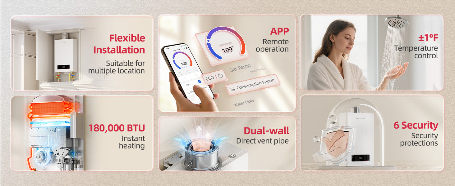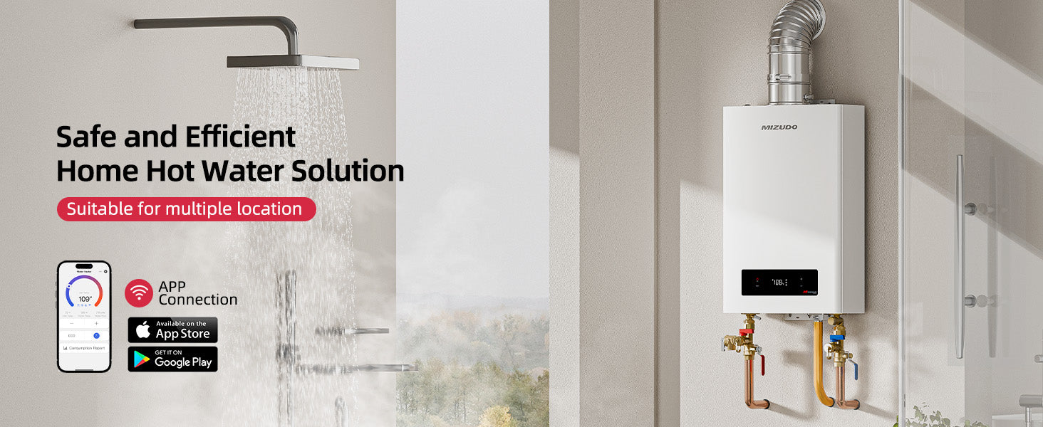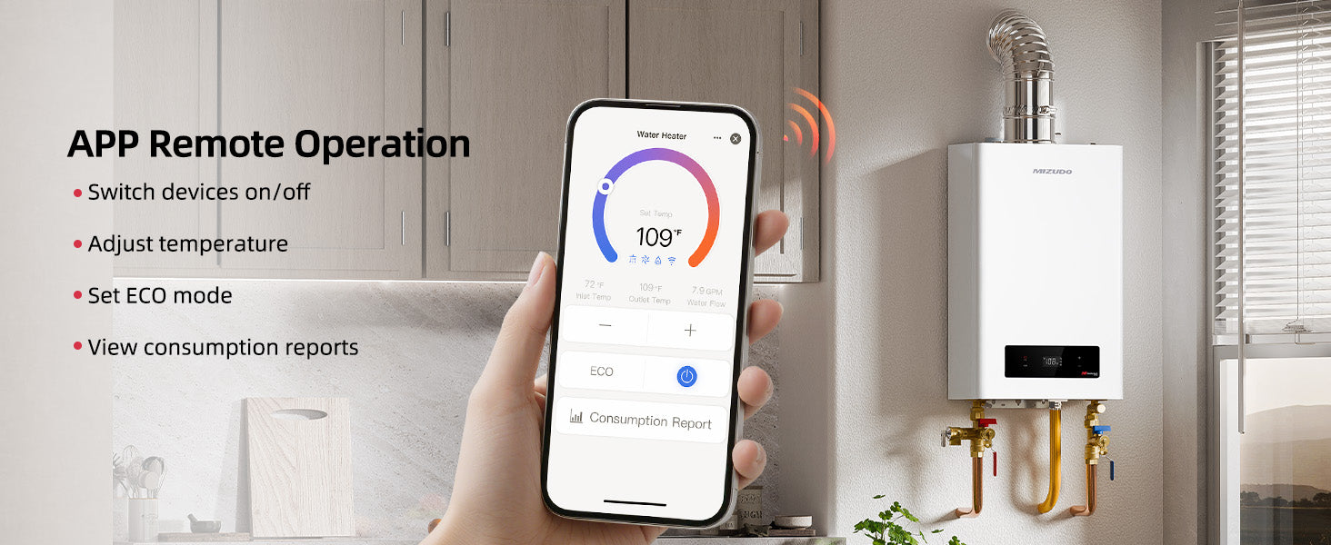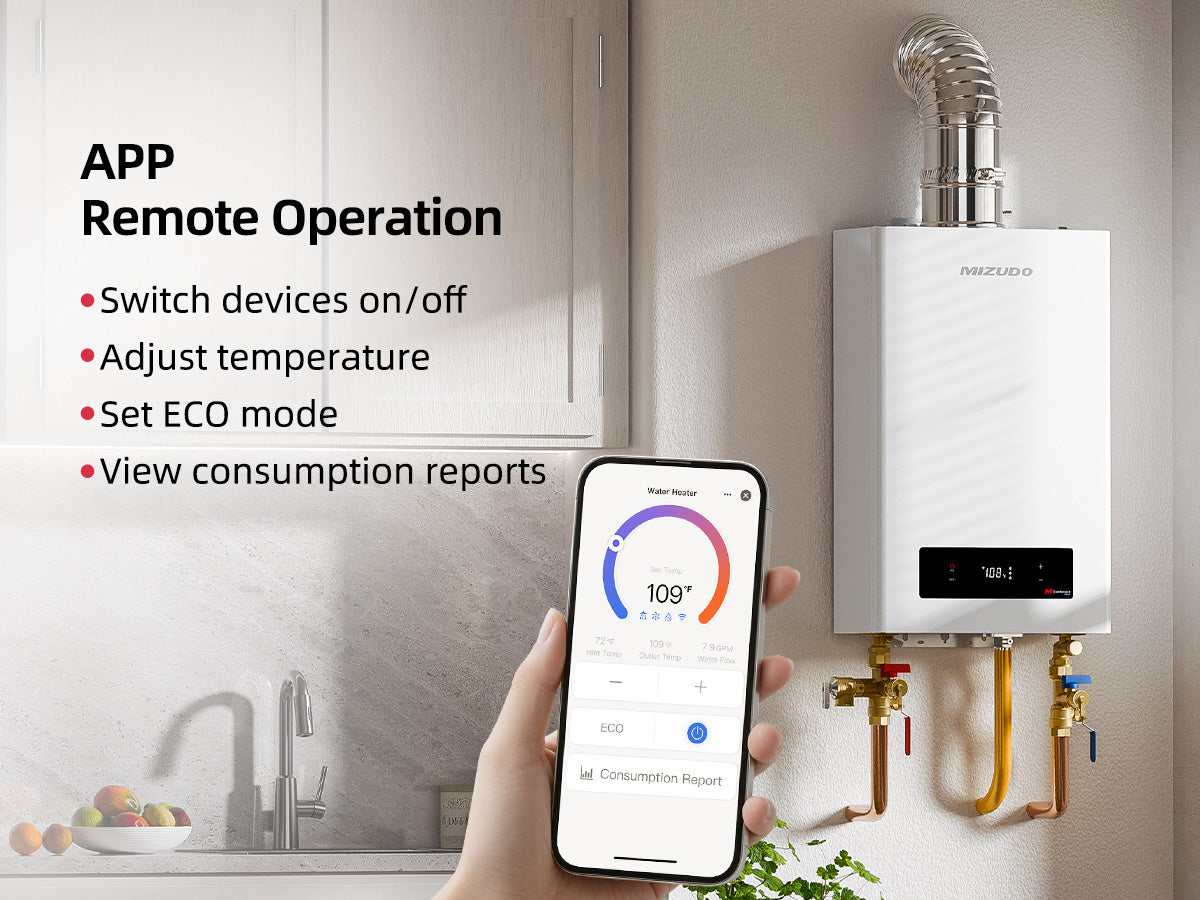 - Smart Wi-Fi Connectivity: Control your Mizudo tankless water heater remotely via the smartphone app, allowing for real-time monitoring and convenient operation.