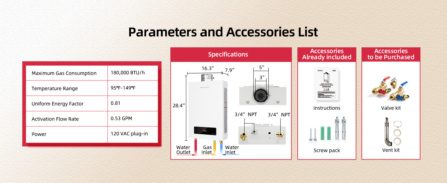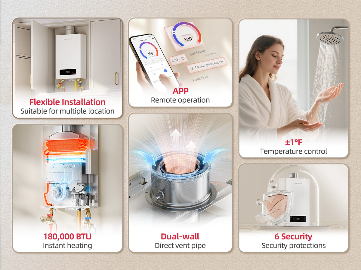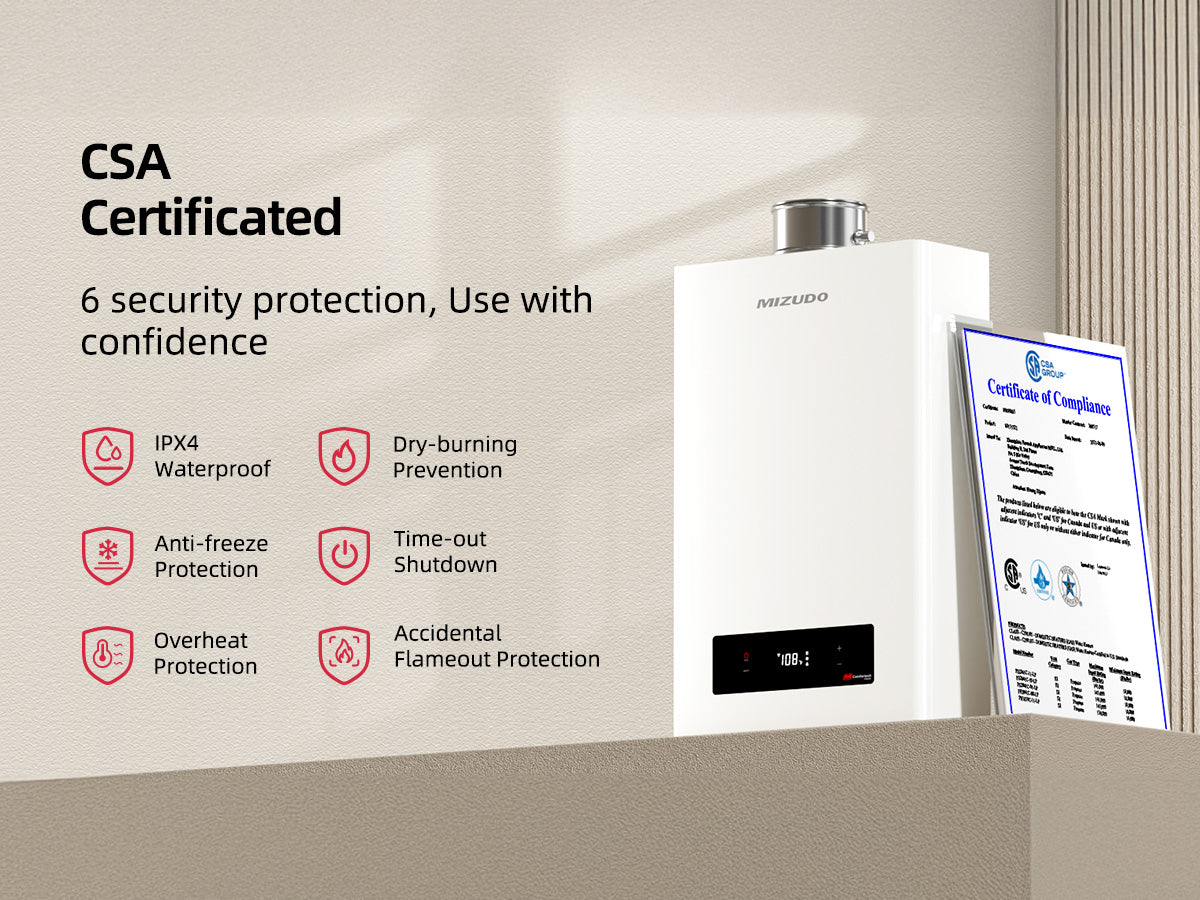 - Certified Protection Features: This CSA-approved water heater includes freeze prevention, dry-fire safeguard, auto-relight, flue obstruction detection, and emergency shutoff.