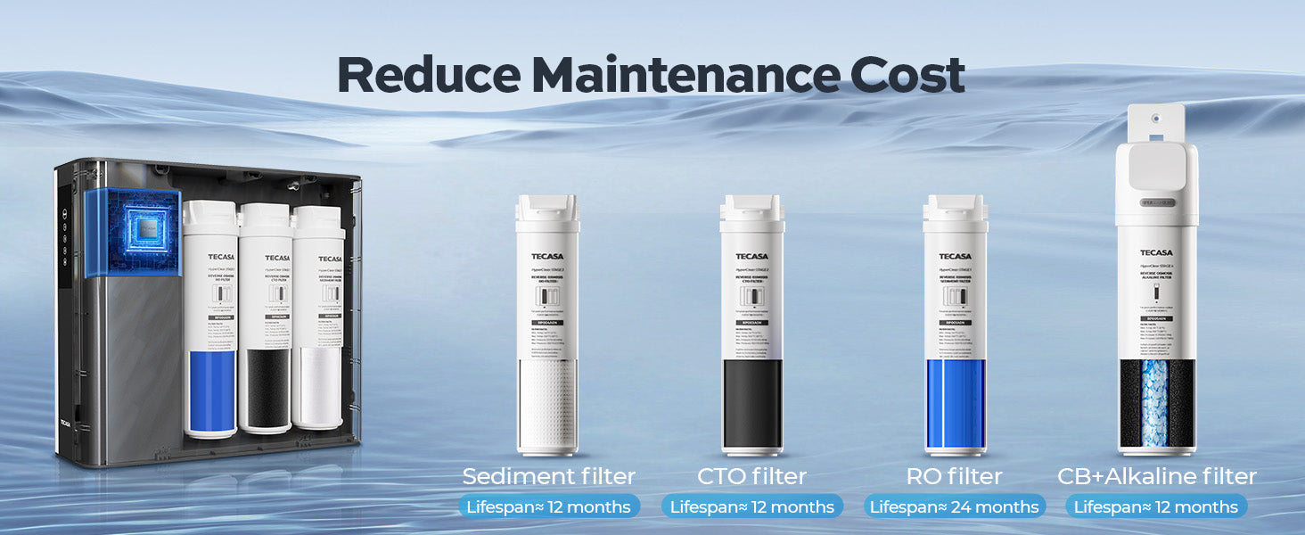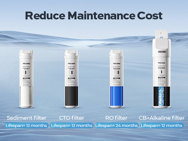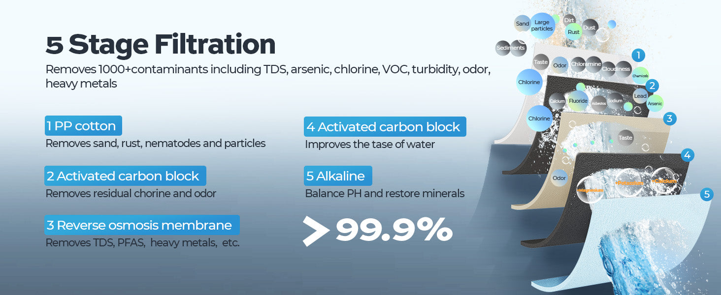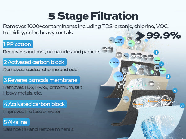 The Reverse Osmosis System: This system includes three prefilters inside the machine (one sediment filter, one CTO filter, and one RO filter), one post-alkaline filter outside the machine, and one pitcher. The prefilters protect against taste and odor-causing contaminants like PFAS, VOCs, lead, fluoride, and arsenic while removing dissolved solids, heavy metals, and over 1,000 harmful substances. The post-alkaline filter enhances water quality by raising the pH and adding essential minerals, resulting in healthier, tastier water. The under-sink water filtration system provides 5-stage filtration with a precision of 0.0001 microns, ensuring your water is essentially pure and certified safe for drinking.