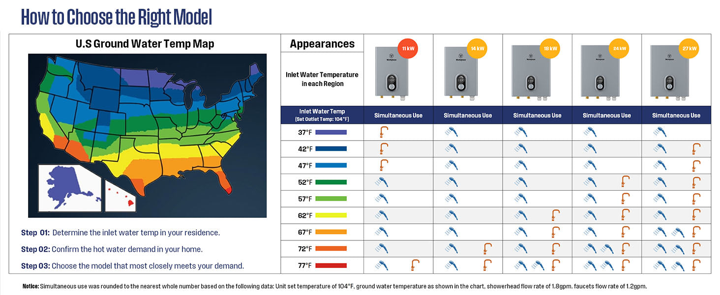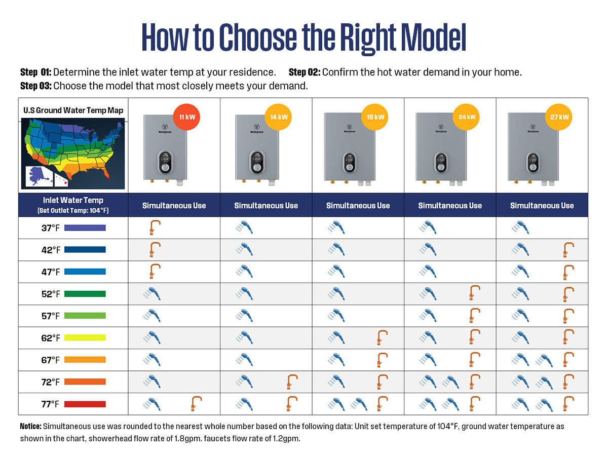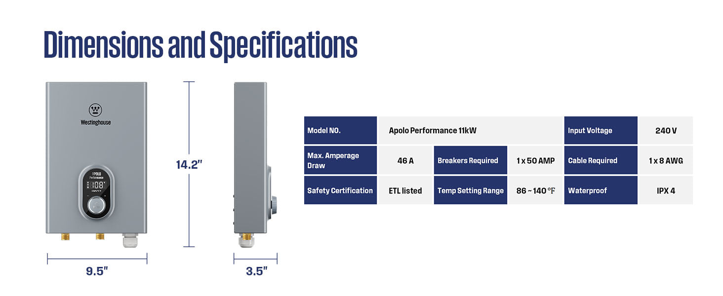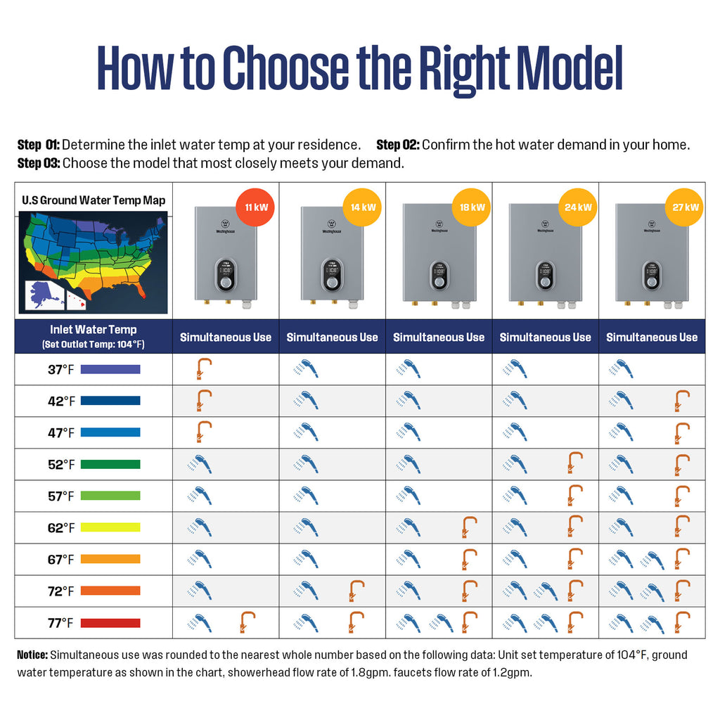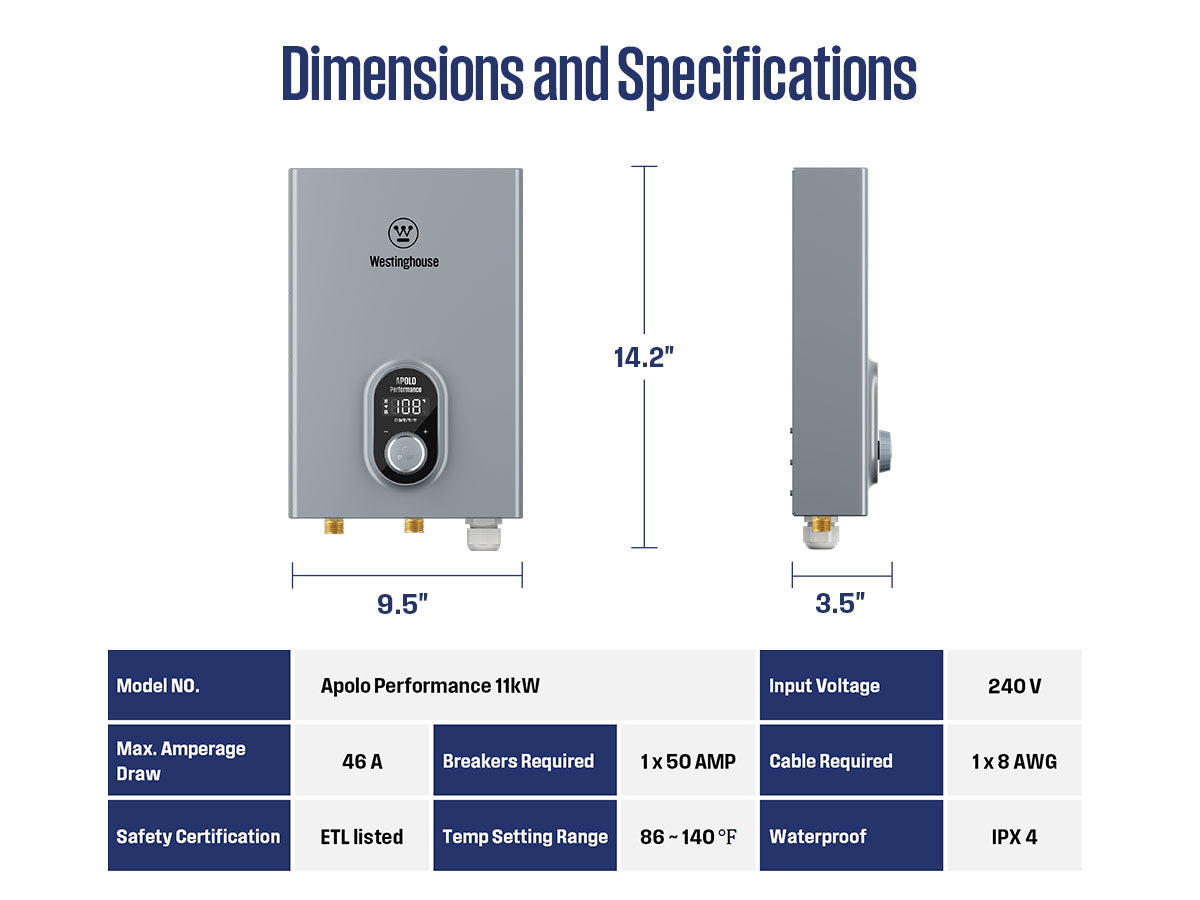 - 【INSTANT HOT WATER FOR 1 SHOWER + 2 SINKS】Westinghouse 11kW electric tankless water heater delivers continuous hot water on demand — perfect for simultaneous use at 1 shower and 2 sinks. Eliminates waiting time and temperature fluctuations during showers, dishwashing, or hand washing.