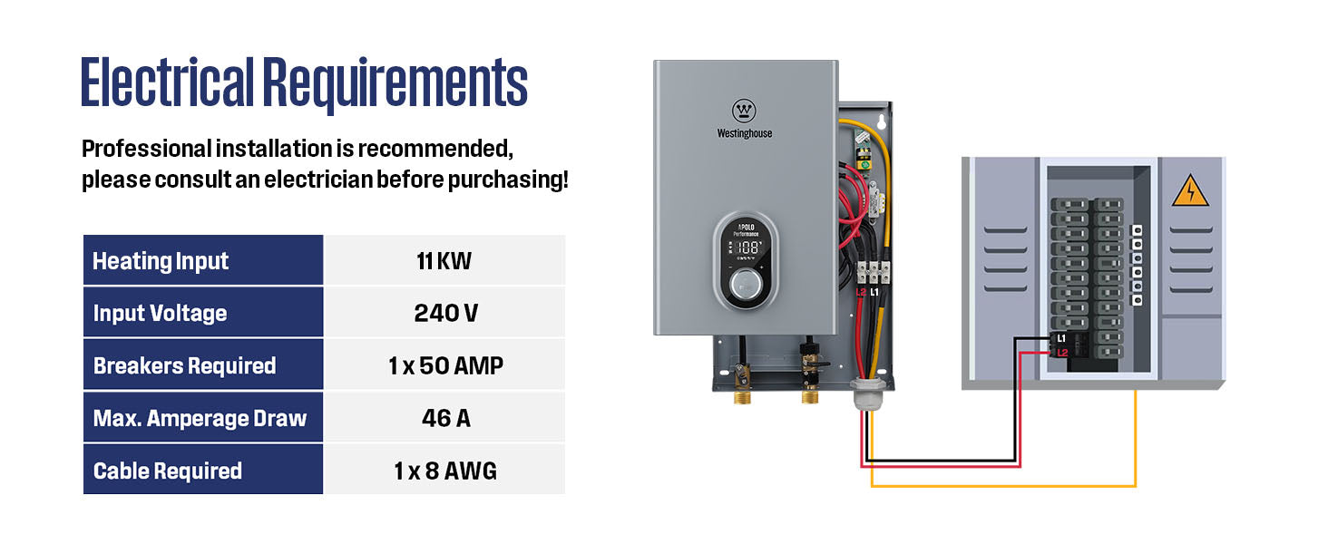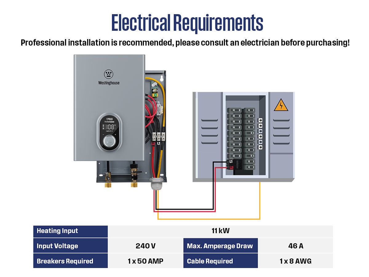 - 【PERFECT FOR APARTMENTS AND HOMES】This 11kW 240V electric tankless water heater efficiently delivers up to 2.6 GPM flow, providing consistent hot water for 1 to 3 points of use simultaneously in apartments, homes, or offices. Activation flow: 0.4 GPM. Requires 46 A and one 50 A double-pole breaker with 8 AWG wiring.