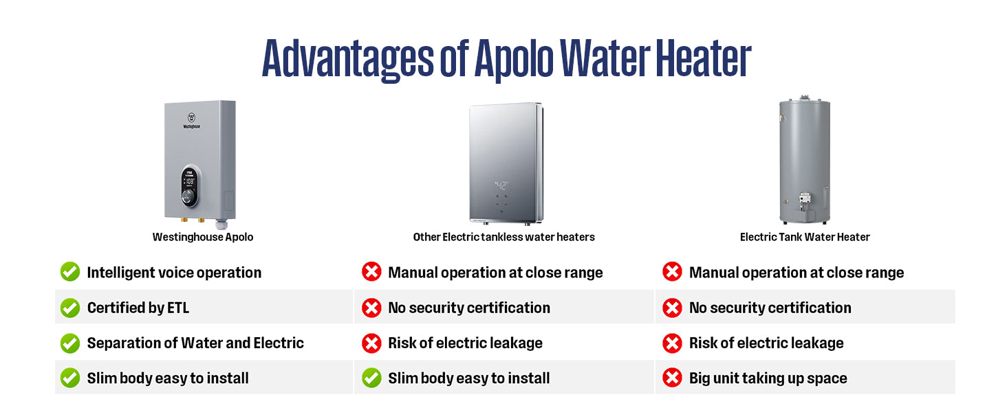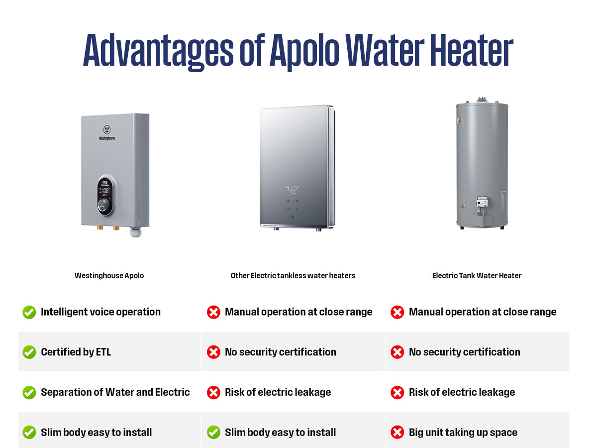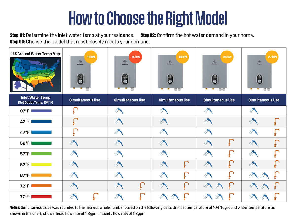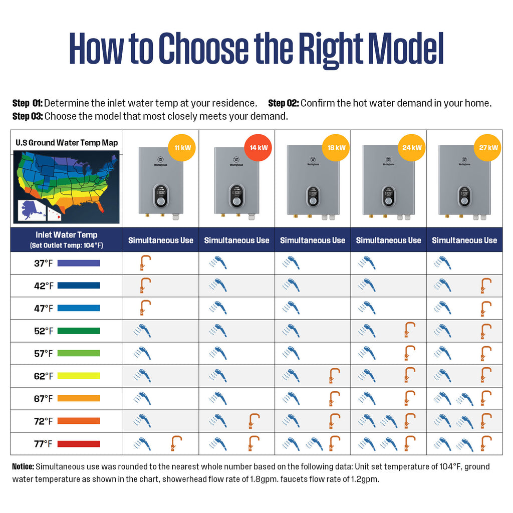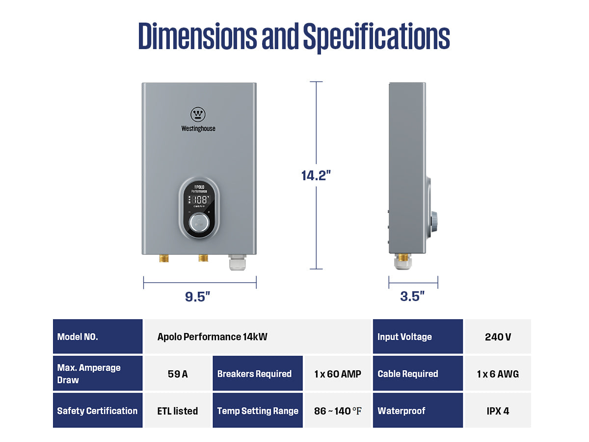 - 【INSTANT HOT WATER FOR 2 SHOWER + 1 SINKS】 Westinghouse 14kW electric tankless water heater delivers continuous hot water on demand — perfect for simultaneous use at 2 shower and 1 sinks. Eliminate waiting time and temperature fluctuations during showers, dish washing, or hand washing.