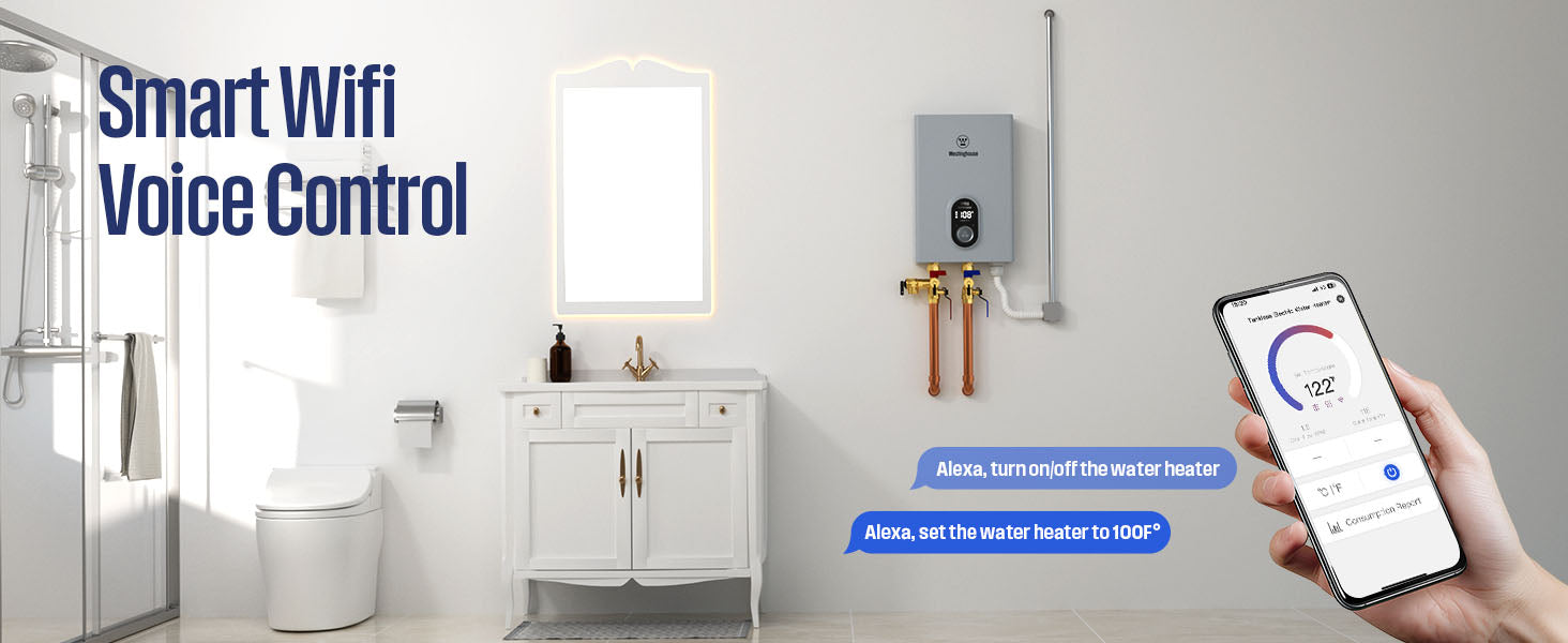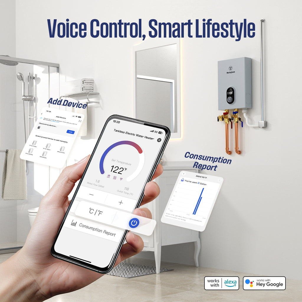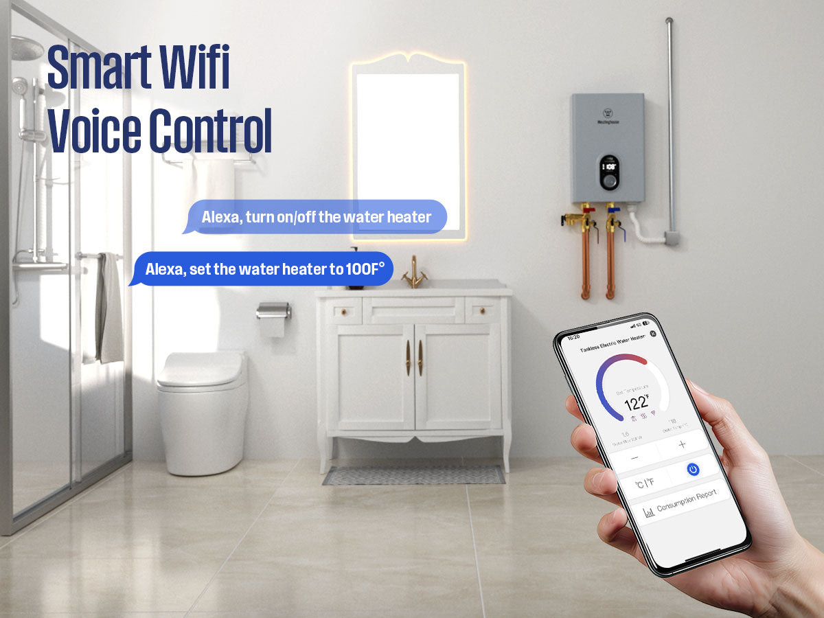 - 【SMART WI-FI VOICE CONTROL】 Control water temperature remotely via the app or voice commands (Alexa & Google Home compatible). Adjust settings from 86°F to 140°F in 1° increments. The LED display shows real-time status for easy monitoring.