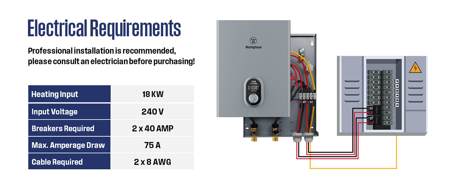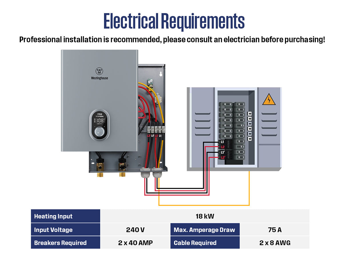 - 【EFFICIENT 18kW PERFORMANCE】Engineered for homes with 75A electrical demand. Compatible with 2 × 40 AMP (DP) breakers + 2 × 8 AWG wiring. Features 3/4" NPT connections and low activation flow (0.66 GPM) for instant response.