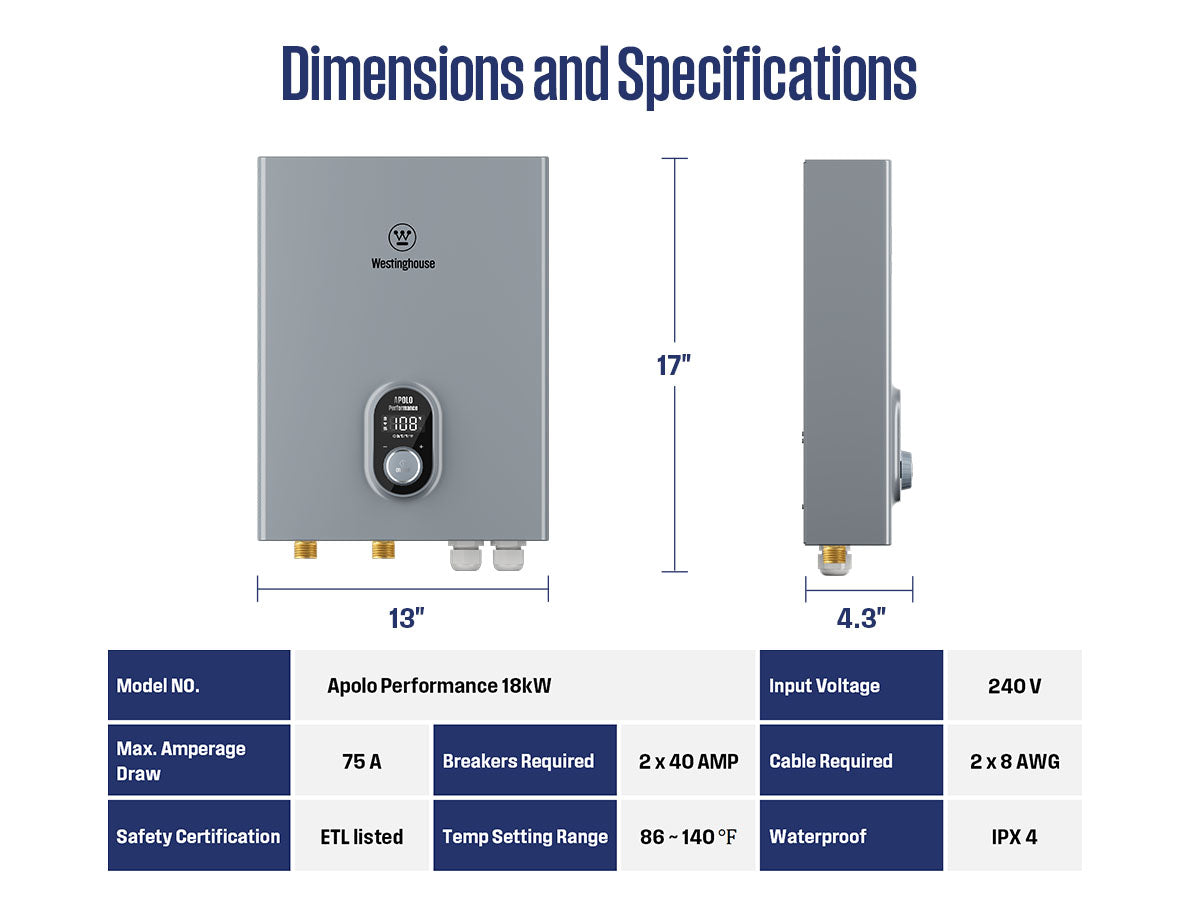 - 【INSTANT HOT WATER FOR 2 SHOWER + 2 SINKS】 Power simultaneous use in 2 bathrooms and 2 sinks! The Apolo-18kW delivers 4.2 gallons per minute (GPM) of continuous hot water – ideal for showers, sinks, and appliances like dishwashers without temperature fluctuations or wait times.