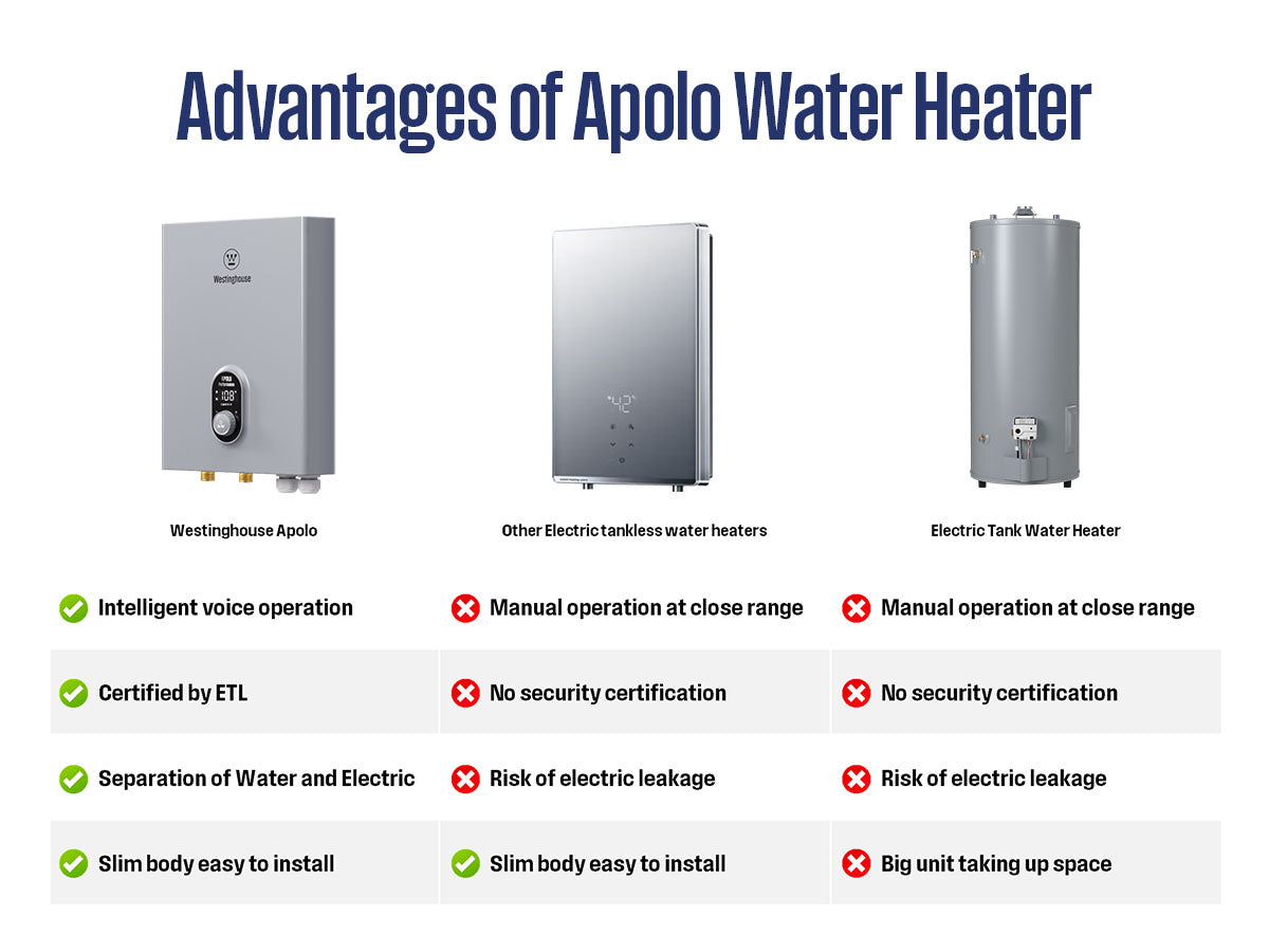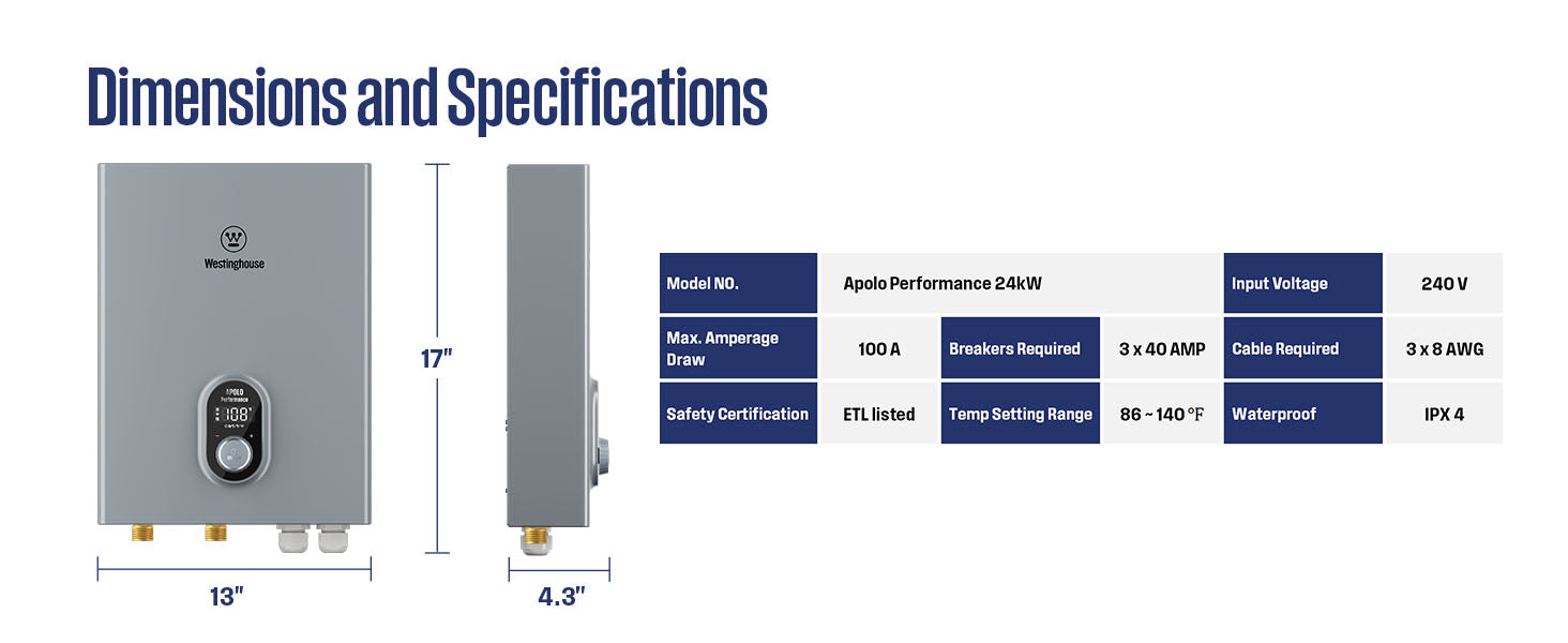 - 【WHOLE HOUSE HOT WATER FOR 3 SHOWER + 2 SINKS】The Apolo-24kW efficiently supplies up to 5.6 gallons per minute (GPM), enjoy continuous, stable hot water on demand for your entire home. Optimized for simultaneous use at 3 shower and 2 sinks. Plus appliances like dishwashers or washing machines – no waiting, no fluctuations.