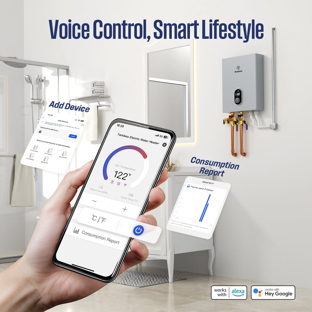 - 【SMART WI-FI VOICE CONTROL】Remotely control water temperature and restart the unit via app or voice commands (Alexa/Google Home compatible). Adjust settings from 86°F to 140°F in 1° increments. The easy-access rotary knob and clear LED display offer convenient local control and real-time status monitoring.